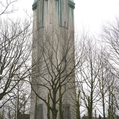 De watertoren, op vierkante plattegrond en bekroond door een achthoekige kop en tentdak met koperen bedekking, is opgetrokken uit een skelet van gewapend beton met een bekleding/vulling van baksteen voorzien van sierpleisterwerk. Oorspronkelijk was het skelet van beton met baksteen zichtbaar. De vierkante afgesnoten opbouw van de toren heeft drie geledingen met erker-vormige uitkragingen in de hoogte en steunberen in de onderbouw. De hoogte van de toren is 48,70 m + maaiveld. Het betonnen skelet van de toren bestaat in hoofdzaak uit zestien kolommen, die naar boven toe verjongen en onderling verbonden zijn door balken met plaatvormige vloeren (werkvloeren) erop. De toren heeft in tegenstelling tot bovengenoemde torens, twee reservoirs.