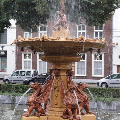 Gietijzeren FONTEIN uit 1885 van de firma I. Schütz en Zoon uit Zeist, gesitueerd aan de oostzijde van het plantsoen tussen de Janssingels. De fontein vormt het middelpunt van een langgerekt rechthoekig bassin, waarvan de lange zijden in het midden een verbreding vertonen.