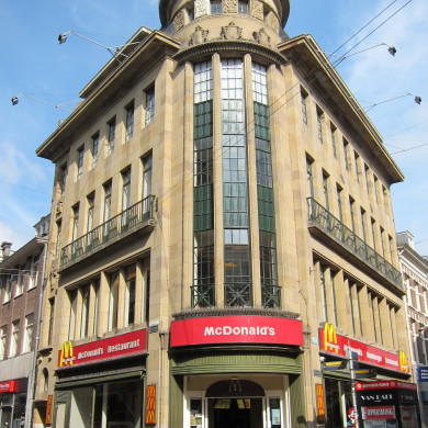 WINKELPAND op een nagenoeg rechthoekig grondplan met een scherpe afgeronde hoek. Het pand bevat een kelder, vier bouwlagen en een zolderverdieping onder een plat dak met aan beide zijden hoge gebroken dakschilden met leien in maasdekking en twee vrijwel over de gehele breedte doorlopende stenen dakkapellen, links met zes en rechts met twaalf vensters. De iets terugspringende kwartronde hoek bevat vijf bouwlagen en wordt op goothoogte bekroond door een ronde toren onder een koperen koepeldak. Het pand heeft een betonskelet en de gevels zijn opgetrokken in blokken van gele zandsteen. De hoge plint is bekleed met granieten platen. De winkelpuien zijn gedeeltelijk gewijzigd. Voor de vensters van de tweede verdieping bevindt zich aan beide zijden een vrijwel over de gehele breedte van de gevel doorlopend Frans balkon met smeedijzeren hek op een vooruitspringende richel met gestileerde bladlijst. De verder vlakke gevels worden afgesloten door een ver overstekende zandstenen goot, waaronder zich wederom een gestileerde bladlijst bevindt.