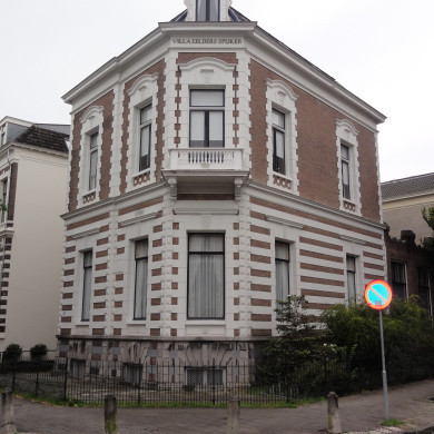 De twee vensters op de eerste verdieping bezitten blokketting omlijsting, afgesloten door een strek met geornamenteerde sluitsteen. Hierboven bevindt zich een schouderboogvormig afgesloten, gepleisterd veld. De vensters zijn voorzien van stolpramen en bezitten aan de onderzijde een gemetseld veld met gepleisterde blokken. De hoektravee is op dezelfde wijze gedetailleerd als de voorgevel. Op de eerste verdieping bevindt zich echter geen venster, maar een dubbele balkondeur met bovenlicht. Het balkon, voorzien van een houten balustrade met gesneden balusters, rust op geornamenteerde consoles. Het fries is voorzien van een opschrift in goudkleurige letters: "VILLA, GELDERS SPIJKER" De nagenoeg symmetrisch ingedeelde RECHTER ZIJGEVEL telt twee traveeën. Het souterrain bezit twee vensters met stolpramen, een hardstenen getande omlijsting, afgesloten door een hardstenen hanekam met een sluitsteen, die is voorzien van een diamantkop. De vensters op de bel-etage en op de verdieping zijn op dezelfde wijze gedetailleerd als de vensters in de voorgevel. De muurdam rechts van de vensters is breder dan de linker muurdam.