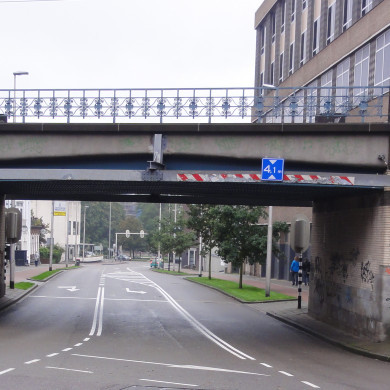 SPOORBRUG in de spoordijk, opgebouwd uit één grote voor het snelverkeer bestemde doorgang (ca. 11 m.), geflankeerd door twee smallere doorgangen voor het langzame verkeer (ca. 3 m.) met elk een doorrijhoogte van 3,8 meter. De overspanningen bestaan uit dertien geklonken stalen I-profielbalken, met daartussen troggewelfjes van onverglaasde gele verblendsteen. De profielen van de grote doorgang zijn licht getoogd, voorzien van ornamenten (o.a. rozetten) en opgelegd op dikke steunmuren. De steunmuren en de landhoofden hebben een plint van natuursteen, een bekleding van onverglaasde gele verblendsteen in kruisverband en een afsluitende lijst van natuursteen die op de afgeronde hoeken voorzien is van vlechtbandversieringen. Boven de profielbalken bevindt zich een betonnen strook waarop een smeedijzeren sierhek (rozet- en krulmotieven) tussen granieten hekpalen. De landhoofden worden afgesloten door een gemetselde borstwering met natuurstenen plint en afsluitende lijst.