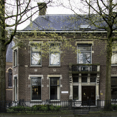 Hieronder bevindt zich een geprofileerde afdruiplijst. De ingangspartij met balkon daarboven is voornaam en fraai gedetailleerd vorm gegeven. Dit blijkt o.a. uit de sierlijke ijzeren trekbel aan de rechterzijde. Drie vierkante en één rechthoekig venster met glas-in-lood met geometrische motieven zorgen voor de lichttoetreding. De ingang wordt gevormd door een aan de rechterzijde aangebrachte vleugeldeur met sierlijke panelen met in reliëf aangebracht houtsnijwerk. In elk van de beide deurhelften zit een rond vensterje met tralies van gedraaid siersmeedwerk ervoor. De natuurstenen ombouw van de vensters en deuren is gedecoreerd met onder andere een rolstaaf, profileringen en rozetten. Het rechthoekige balkon rust op vier bewerkte consoles, waarvan de twee buitenste getrapt zijn en de twee binnenste gegroefd. Het balkon wordt begrensd door bewerkte natuurstenen pijlers onder een afdeklijst. Tussen deze pijlers is een ijzeren hekwerk met geometrische motieven aangebracht. In het voorste dakschild is recentelijk een een rechthoekig venster met klapraam geplaatst. Op de hoeken van het platte dak bevinden zich twee forse gemetselde schoorstenen. Opvallend detail is de rechthoekige overhoekse hoekerker die zich aan de kerkzijde bevindt en twee bouwlagen heeft, zij het dat de bovenste daarvan iets lager is dan de corresponderende bouwlaag van de hoofdmassa. De zijgevels zijn in opzet vrijwel gelijk aan de voorgevel, al is de detaillering hier soberder. Zo is er geen gebruik gemaakt van hardsteen in de plint en hebben de vensters geen glas-in-lood in de bovenlichten. De plint, die dezelfde hoogte heeft als die van de voorgevel, bestaat hier uit een iets donkerder baksteen die van het bovenliggende gedeelte gescheiden is door een rollaag.