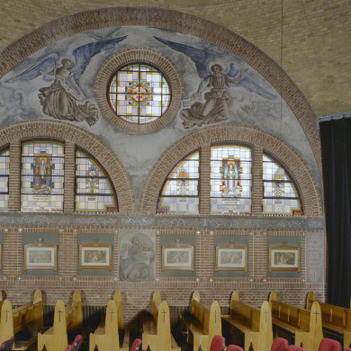 In het portaal van de kapel bevindt zich de eerste steen met het volgende opschrift: "Gezegend door de Zeereerw. Heer Arn. J.J. Verhoeven, rector. Gelegd door den Zeereerw. fr. M. Eligius sup. gen. en fr. M. Chrysolgus, vic. 19-2-1925". Inwendig wordt de kapel overdekt met een in baksteen gemetselde koepel met twaalf ribben met een rondvenster in de kruin onder de lantaarn, dat voorzien is van glas-in-lood. In een rand ter hoogte van de geboorte van de koepel staan de symbolen van de dierenriem uitgespaard. Het rechtgesloten koor en de vier pendentieven van de kapel hebben een rondboog. De kapel is uitgevoerd in schoon metselwerk, dat afgewisseld wordt door stucwerk. Het basement en opgaande muren bestaan uit rode baksteen gemetseld in kruisverband, de koepel in gele baksteen. Het stucwerk bevat fresco's van de hand van Luc. van Hoek (Goirle). De kapel bevat twee biechtstoelen en een zangzolder. Het koor, altaar en communiebank zijn van marmer. De laatste heeft een koperen balustrade met medaillons met afbeeldingen van Het Lam Gods en een pelikaan met jongen. De glas-in-lood vensters onder andere met gebrandschilderde figuratieve afbeeldingen met de teksten: Obedientia, Mansuetudo, Castitas, Pietas, Mortificatio en Humilitas zijn uit het atelier van Van den Berg (Dordrecht). De kapel heeft een bronzen kroonluchter met acht lampen.