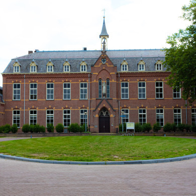 Neogotisch BEELD van de H. Franciscus, afkomstig uit een nis boven de entree van het hoofdgebouw, nu herplaatst naast de kapel.