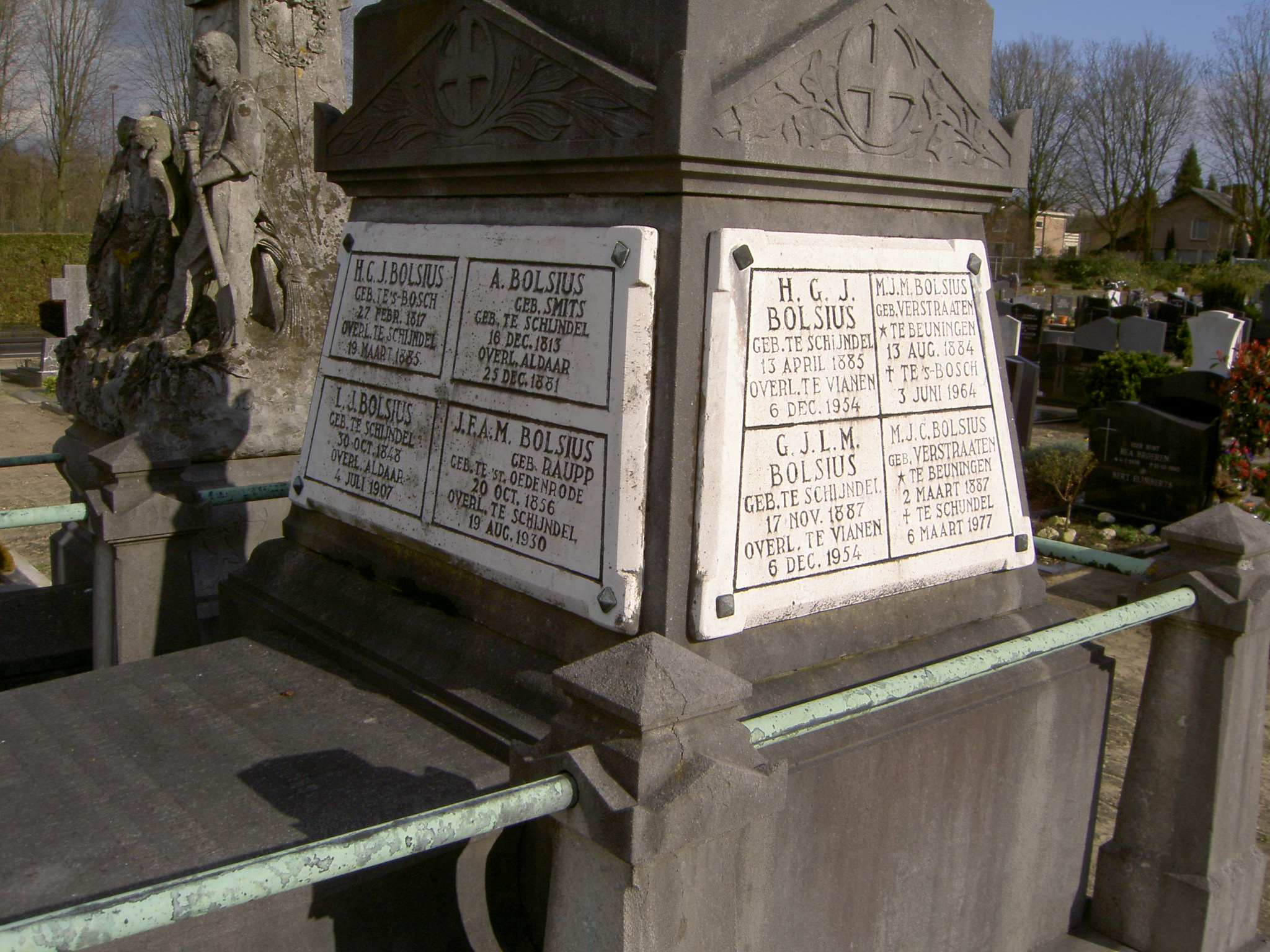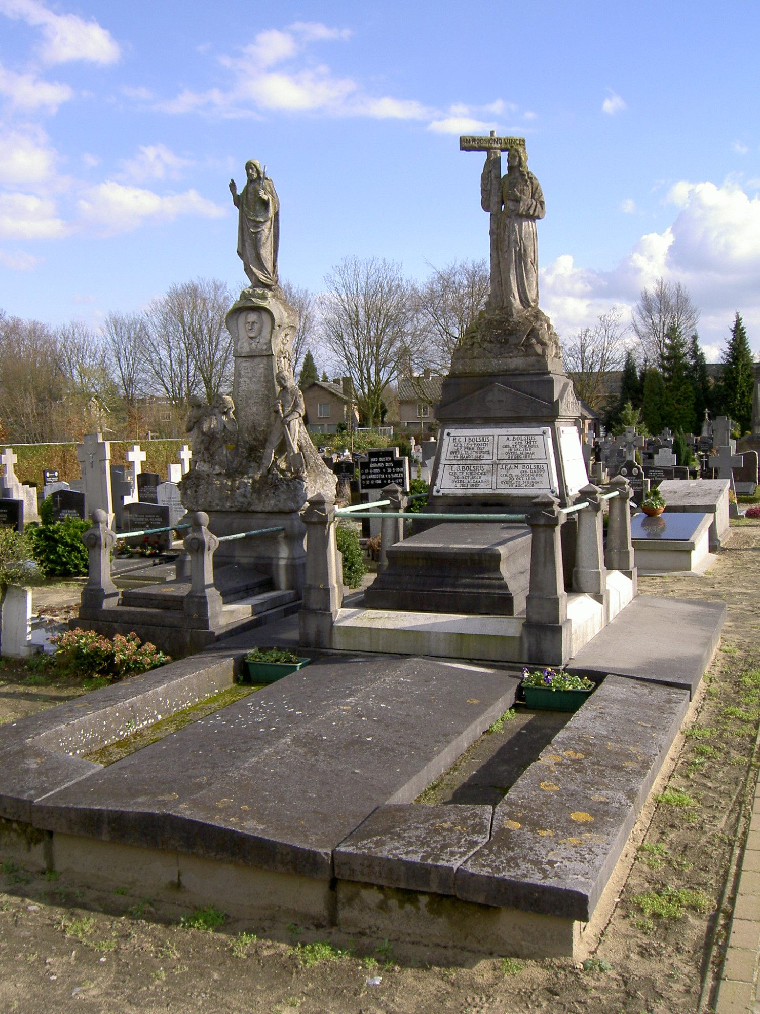 Op de andere helft verheft zich op de middenas een met zes pijlertjes afgezette hardstenen basis, precies in het verlengde van voornoemde afdekplaat en van dezelfde breedte. De zich verjongende, in geometrische vormen gebeeldhouwde pijlertjes zijn onderling verbonden middels een koperen stang en omzomen een licht oplopende tombe die met haar hoofdeinde opgaat in het onderste deel van een haaks erop geplaatste, driedelige opstand. Op de vier zich verjongende zijden van het middendeel zijn witmarmeren plaquettes geschroefd. Het bovendeel heeft aan elke zijde een in reliëf gehouwen frontonachtige driehoek, via acroteriën met elkaar verbonden, met binnen het driehoekige veld twee gekruiste palm- of looftakken onder een kruisnimbus, symbolisch voor de Overwinning in de zin van de gelukkige voleinding van het leven. Deze opstand wordt bekroond met een kalkstenen sculptuur van een op een stapel rotsblokken staande vrouwenfiguur. Aan haar voeten een wapenschild met de tekst 'RUSTPLAATS FAMILIE BOLSIUS' en in haar rechterhand een (versoberd, bovenste arm afgebroken) kruis met de epitaaf 'IN HOC SIGNO VINCES'. De vrouwenfiguur, met lange golvende haren is blootvoets en draagt een lang gewaad met een als ceintuur geknoopt doek om haar middel.