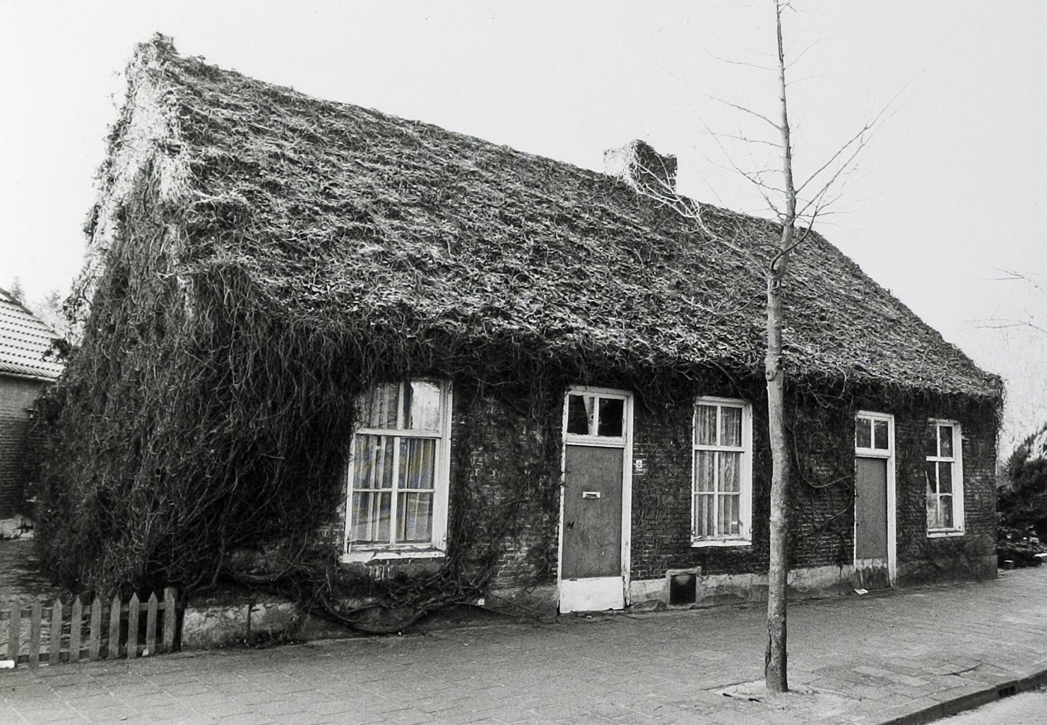 Dorpswoningen onder zadeldak tussen zij-topgevels. Schuiframen met kleine roedenverdeling, 19e eeuw.
