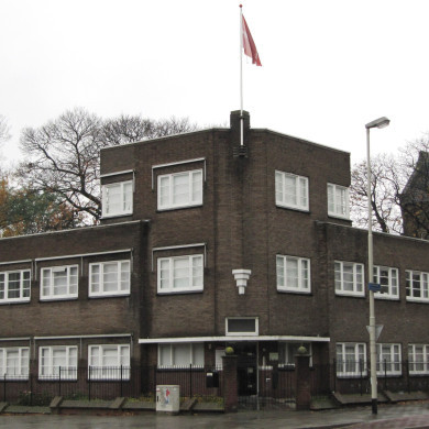 Het tot drie bouwlagen opklimmende hoekpand met platte daken heeft een vrijwel vierkante plattegrond. De gevels zijn opgetrokken uit machinale baksteen, met een donkerder kleur voor de plint. De bouwmassa's klimmen trapsgewijs op van een eenlaagse achterbouw tot het drielaagse middendeel. Dit heeft een afgeschuinde hoek en springt ten opzichte van de tweelaagse delen ernaast terug, zoals deze op hun beurt weer inspringen ten opzichte van de eenlaagse hoekdelen. Het pand is symmetrisch van opzet, iedere zijde telt totaal vijf vensterassen met brede laddervensters. Deze hebben houten kozijnen en zwart geglazuurde betegelde dorpels. Bij het hoogste en het laagste bouwdeel worden de vensters om de hoek doorgezet. In de afgeschuinde smalle hoek bevindt zich de vernieuwde entree met bovenlicht onder een brede, omgaande betonnen luifel. Hierboven bevindt zich een Expressionistisch gemetseld deel met betonnen sierstukken als onderbouw voor de vlaggemast. Waar de frontzijde van de bouwmassa's een gesloten geheel vormen, schuiven de delen hier uiteen. Het drielaagse gedeelte steekt uit naar achteren en bezit drie smalle hoge raamstroken, waarachter zich de trappartij bevindt. Het pand is opgevat als een plastische eenheid, waarbij de hoogteverdeling en raamindeling aan de zijden en in de achtergevel overeenkomen met de voorgevel.