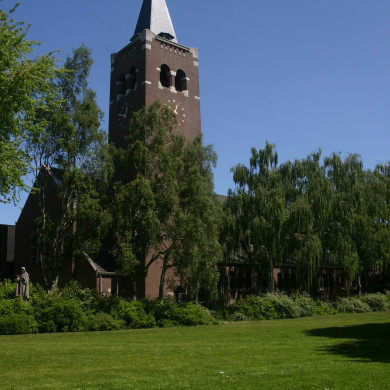 KERK, gebouwd in 1936 in Delftse Schoolstijl. Het ontwerp voor kerk en pastorie werd gemaakt door ir. J.B. Sturm in samenwerking met ir. J. van der Laan. Waar Sturm in het ontwerp van de pastorie de overhand heeft gehad is de kerk vooral door Van der Laan ontworpen. De eerste steen werd op 5 juli 1935 gelegd, de wijding aan het Heilig Hart van Jezus vond plaats op 16 april 1936. In 1980 werd de kerk verbouwd. Hierbij is vooral het interieur aangepast, het priesterkoor werd onder andere vergroot. De kerk staat aan het Heilig Hartplein, het centrum van de nieuwbouwwijk Kalsdonk.