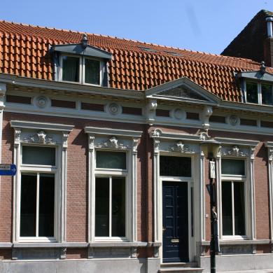 WOONHUIS, gebouwd in het laatste kwart van de negentiende eeuw, in Eclectische stijl. Het hoekhuis heeft de voorgevel aan de Markt, de zijgevel grenst aan de Omgang.