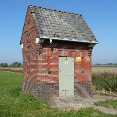 TRANSFORMATORGEBOUW opgetrokken in een rode baksteen op een trasraam van trasraamklinkers afgezet met een rollaag. Het zadeldak, gedekt met een grijze tuile du Nord, heeft een houten overstek met een mastgoot en een muizetandfries. De beide uitkragende topgevels zijn voorzien van twee gepleisterde aanzetstenen, siermetselwerk en twee lichtsleuven dichtgezet met rode baksteen. De zuidoostgevel heeft een dubbele stalen deur met ijzeren gehengen en de zuidwestgevel een stalen deur tussen twee dichtgemetselde lichtsleuven, alle onder een anderhalfsteens rollaag; de noordwestgevel heeft een stalen ventilatierooster in het trasraam, de noordoostgevel twee dichtgemetselde lichtsleuven onder één anderhalfsteens rollaag. Een eensteens gevelband verbindt deuren en sleuven. Op de hoek van de zuidwest- en noordoostgevel en op de hoek van de zuidoost- en de noordwestgevel een trapsgewijs gemetseld muurtje opgetrokken in een trasraamklinker.