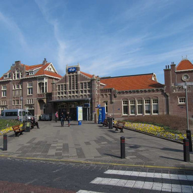 SPOORWEGSTATION met perronoverkapping, gebouwd in 1908 in Berlagiaanse trant, mogelijk naar ontwerp van D.A.N. Margadant. Het station is gebouwd tegen een duinhelling. Hierdoor ligt het stationsgebouw hoger dan de sporen en heeft de spoorzijde van het stationsgebouw één bouwlaag meer dan de straatzijde. Oorspronkelijk kwamen bij het stationsgebouw twee perronoverkappingen voor, waarvan echter die evenwijdig aan de sporen in augustus 1996 is gesloopt.
