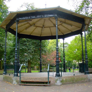 MUZIEKTENT in een vormgeving die aansluit bij de traditie van de Neo-Hollandse-Renaissance, stamt uit het eind van de 19de eeuw en is gesitueerd in het zuidelijke, brede gedeelte van het park, nabij de Vijverstraat.