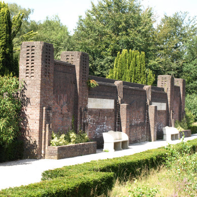 HERDENKINGSMUUR, op circa zestig meter ten noorden van en evenwijdig aan het hoofdgebouw staat als onderdeel van het GEDENKTEKEN van het Belgenmonument deze herdenkingsmuur.