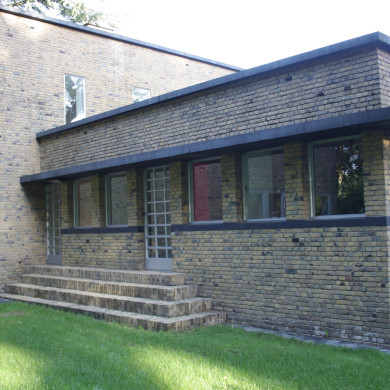 Een reeks garderobenissen worden geleed door een ritmische opeenvolging van kolommen. Deze opdeling komt ook tot uitdrukking in de uit gele bakstenen opgetrokken gevels, waar aan de gangzijde een opeenvolging van tientallen gelijkvormige smalle verticale stalen vensters zijn aangebracht. De gevels aan de lokaalzijde zijn zeer open van karakter. Op de begane grond en de eerste verdieping zijn over de gehele lengte van de gevels uitkragende strokenvensters aangebracht, die vrijstaan van de betonconstructie.