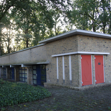 Tegen de blinde achtergevel bevindt zich een lange bouwmassa bestemd als fietsenstalling. Dit in zeven traveeën ingedeelde volume bestaat uit bakstenen kolommen die aan de bovenzijde licht zijn ingesnoerd. Hierop liggen zes zware, uitkragende betonnen draagbalken met daarboven een overkragend, plat dak. De eerste, aan het trafohuis rakende travee, is van oorsprong dichtgemetseld met in het midden van de rechter gevel een deur.