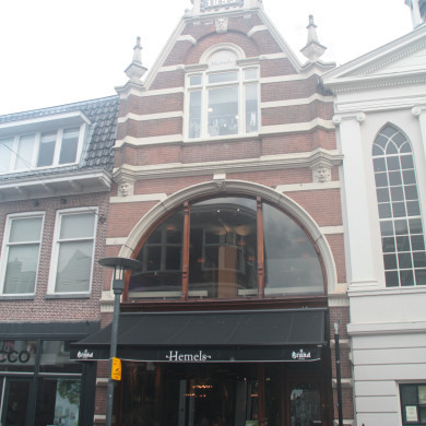 De rechter zijgevel wordt geheel in beslag genomen door de naast het winkelpand gesitueerde kerk.