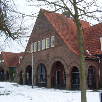 In de topgevel zijn vier zeslichts vensters aangebracht met geheel in de top een klein tweelichts venster. Geometrische patronen verlevendigen de baksteengevel. Vier dakkapellen, twee aan iedere zijde van de topgevel bestaan uit twee openslaande zeslichtsvensters met plat dak. De gevels van de vleugels zijn identiek aan die van de voorgevel.
