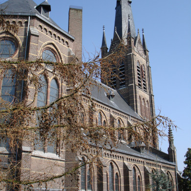 De kruisbasiliek heeft een schip van vijf traveeën, een eenbeukig transept met driezijdig gesloten armen, gevolgd door één koortravee en een koor van twee traveeën en een driezijdige sluiting. De gevels zijn gemetseld in baksteen en worden geleed door banden van gele strengperssteen, hardstenen afzaten, dorpels, dekplaten en lijsten. Tegen de gevels staan, afhankelijk van de hoogte, twee of driemaal versneden steunberen. De gevels worden afgesloten met een keperboogfries en muizentandlijsten.