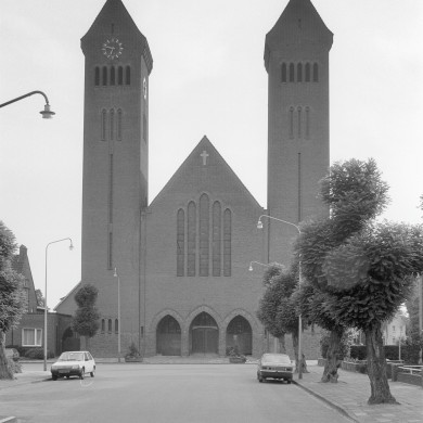 De ACHTERGEVEL van het koor is ingesloten tussen twee sacristieën. In de gevel bevinden zich keperboogvensters en honingraatvensters met betontracering.