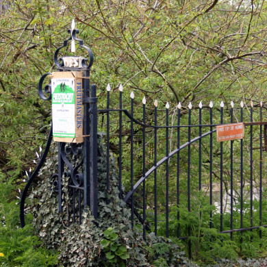 Op de toegang van de oprijlaan is een smeedijzeren toegangshek geplaatst, bestaande uit een dubbel toegangshek met speerpunten bekroonde spijlen, geflankeerd door van opengewerkte, decoratief gebogen smeedwerk voorzien rechthoekige staander, welke beëindigd worden door met speerpunten versierde decoratief gekrulde wangen. De staanders worden bekroond door de naam van de boerderij "WEST" - "DORP".