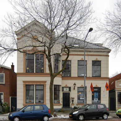 In het midden van de linkerzijgevel (O) zijn beneden één en op de eerste verdieping twee zesruits schuifvensters aangebracht. Links hiervan bevindt zich op beide verdiepingen een klein, hoog geplaatst venster. Ter hoogte van de mezzaninoverdieping rechtsboven is onder de kroonlijst een vierruits venster aangebracht en erboven een gecementeerde schoorsteen. Halverwege deze gevel staat een tweede schoorsteen uitgevoerd in rode machinale baksteen. De dakkapel rechts hiervan heeft twee vierruits schuifvensters, een kroonlijst en een plat dak. De door een hoofdgestel beëindigde achtergevel (Z) wordt ter hoogte van de begane grond door een moderne aanbouw aan het oog onttrokken (de vijf vensters van de eerste verdieping zijn in XXd vernieuwd).
