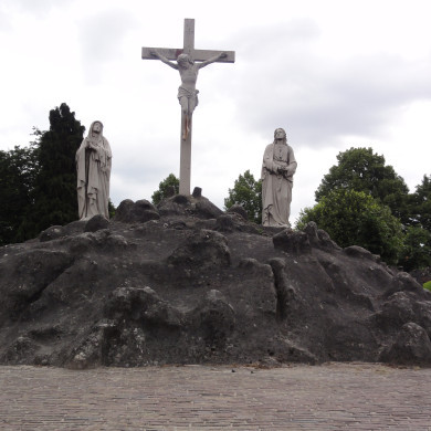 Op een brede, lage heuvel met een ronde omtrek staan de gietijzeren beelden van Maria, Johannes en de gekruisigde Christus. De betonnen heuvel is vormgegeven als een onregelmatige rotsklomp. Het Johannesbeeld heeft onder aan de voet een vaantje met de initialen: "R.J".