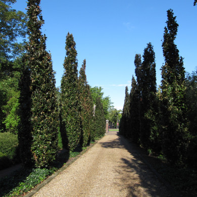 Het zuidelijke deel van de begraafplaats wordt gedomineerd door een symmetrisch assenpatroon van rechte en halfronde paden die omzoomd zijn met piramidaal gesnoeide meelbesbomen.
