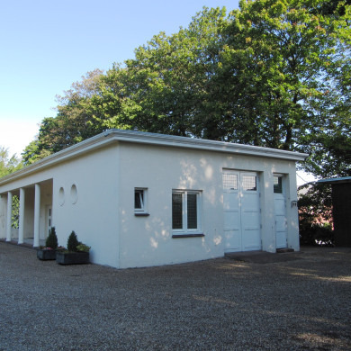 Eenlaags, rechthoekig, grijs gepleisterd pand onder een plat dak met een als kroonlijst uitgevoerde gootlijst. De voorgevel (zuid-west) bestaat voor 2/3 deel uit een door vier zuilen ingedeelde loggia waarachter twee dubbele paneeldeuren en een dubbele deur met vensters geplaatst zijn. De vloer van de galerij is belegd met terrazzo. In de linker zijwand van de galerij bevindt zich een rechthoekige, rastervormig ingevulde opening. In het rechter deel van de voorgevel zijn twee ronde vensters geplaatst. De linker zijgevel bevat drie geschakelde vensters onder een doorlopende latei.