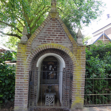 ONZE LIEVE VROUWEKAPEL, geplaatst ter linkerzijde van het hekwerk van de villa aan de Daniël de Brouwerstraat 28. Het oorspronkelijke kapelletje werd op deze plek gebouwd door Petrus Koymans (1732-1810), de tweede opvolger van Daniël de Brouwer. Het werd tussen 1871 en 1878 ommetseld en kreeg toen de huidige vorm. In de loop van de tijd hebben er verschillende Mariabeelden in gestaan.