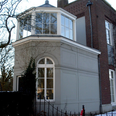 Aan de linkerzijde met het laboratorium verbonden voormalig speelhuis en latere zaadkoepel. Het gebouwtje ligt iets terug van de rooilijn. Het terrein ervoor wordt afgesloten met een eenvoudig gietijzeren spijlenhek, waarin twee vleugels tussen stijlen als toegang tot het gebouw. Klein octagonaal gebouwtje bestaande uit een kelder, een begane grond met daarop een eveneens achtzijdige lichtkoepel. De onderbouw en de betegelde kelder hebben een binnenwerkse maat van 4.14 m. De onderbouw is gepleisterd en voorzien van eenvoudige geledingen met waterlijsten en spaarvelden e.d. Hierin een eenvoudige toegangsdeur aan de NO-zijde en verder omlijste rondboogvenster en een kroonlijst. Boven de kroonlijst is de koepel aangebracht met grote zesruitsvensters tussen smalle pilasters, waarboven een kroonlijst en een tentdak met zinken bedekking en piron.