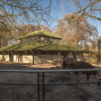 Uit het laatste kwart van de 19de eeuw daterend DIERENVERBLIJF (18) in oorsprong bestemd als moeflonstal onderdeel van het Artis-complex. De stal ligt nagenoeg op de grens tussen de westelijke en oostelijke helft van de aanleg ten zuiden van de middenas.