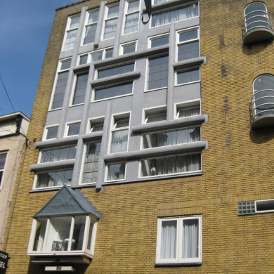 Boven de nrs. 45 en 47, vanaf de tweede verdieping tot onder de daklijst, wordt de gevel onderbroken door een groot vlak met door verticaal en horizontaal geplaatste betonnen roeden onderverdeelde vensters. Direct boven de daklijst vier ovaalvormige bekroningen.