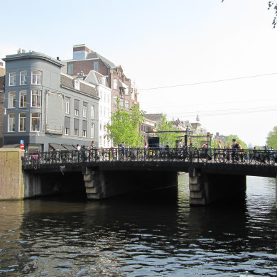 In 1921 tot stand gekomen vaste PLAAT- of BALKBRUG met drie doorvaarten naar een ontwerp in Amsterdamse School-stijl van P.L. Kramer in opdracht van de afdeling Bruggen van de toenmalige dienst der Publieke Werken in de gemeente Amsterdam. Het beeldhouwwerk was al in 1916 ontworpen door Hildo Krop en uitgevoerd door de firma Johan Polet. De brug (brugnummer 68) overspant de Prinsengracht en ligt in de Leidsestraat.