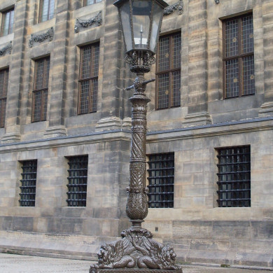 Vier aan de Damzijde en twee aan de Nieuwe Zijds Voorburgwalzijde van het Paleis in 1844 geplaatste en van gietijzer vervaardigde LANTAARNS naar een ontwerp van M.G. Tetar van Elven. Op bevel en op kosten van Zijne Majesteit Willem I. De lantaarns werden gegoten bij Dixon & Co. te Amsterdam.