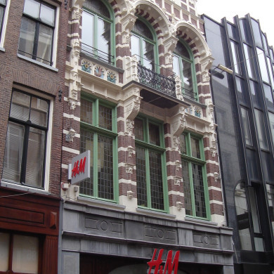 In 1892-'93 in een mengeling van Neo-Gotiek en Neo-Renaissance tot stand gekomen WINKEL met bovenwoning naar een ontwerp van G. van Arkel en W. Wilkens in opdracht van Anton Huf jr. N.B. Verbouwing in 1926 door Ten Bosch & Legrand. Winkelpui later (XXB) vernieuwd.