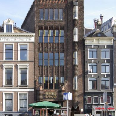 Op een nagenoeg rechthoekig grondplan tot stand gekomen gebouw met vijf bouwlagen. Voornamelijk plat dak met steile schilden met shingles. Bakstenen gevels in verschillende metselverbanden. De gevel aan de zijde van de Prins Hendrikkade is asymmetrisch en sterk geleed. Aan de rechterzijde een gesloten geveldeel met smalle halfronde uitbouw over alle verdiepingen. Per verdieping hierin een halfrond venster met recent raam met kalf. Verder halfrond gemetselde delen met uitkragende banden. Op de begane grond een toegangspartij met portiek met schuine bovenwanden en decoratief metsel- en tegelwerk en natuurstenen hoekstuk. Aan de onderzijde van de halfronde uitbouw een ornament met concentrische ringen. In het opgaande metselwerk getande bakstenen stijl. Aan de linkerzijde boven de begane grond een horizontaal geveldeel met afwijkend baksteenformaat. Hierop metalen regelwerk waarop 'GEBOUW BATAVIA'. Aan weerszijden gemetselde accenten met uitkragende banden. Op de accenten bouwbeeldhouwwerk voorstellende groepen apen. Serie van vijf hoge vensteropeningen met recente ramen. Dergelijke vensters ook op de verdiepingen. Smalle doorlopende muurdammen en decoratief gemetselde geveldelen tussen de verdiepingen. Overig bouwbeeldhouwwerk voorstellende olifantenkoppen. Vierde verdieping als gevel beëindiging in versoberde uitvoering, afgesloten met reeks licht gepunte kantelen. Geheel links een hoger doorlopende muurdam met opzetstuk. Aan de zijde van de Oude Zijds Kolk bevindt zich een symmetrische en sterk gelede gevel. Corresponderend met de gevel aan de zijde van de Prins Hendrikkade ook hier een horizontaal geveldeel met afwijkend baksteenformaat. Ook hier metalen regelwerk waarop 'GEBOUW BATAVIA'. Onder dit deel de eenvoudige vensters van begane grond en souterrain. De series van vijf vensters op de eerste, tweede en derde verdieping hebben nog de oorspronkelijke bovenlichten met glas-in-lood raamvulling. Overige delen met doorlopende smalle muurdammen en decoratief gebruik van metselwerk tussen de verdiepingen is overeenkomstig de gevel aan de zijde van de Prins Hendrikkade. Eenvoudige en rechte gevelbeëindiging.
