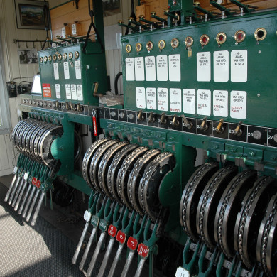 INTERIEUR met authentiek mechanisch beveiligingsysteem met bloktoestellen en hendelinrichting ten behoeve van de armseinen en wissels.