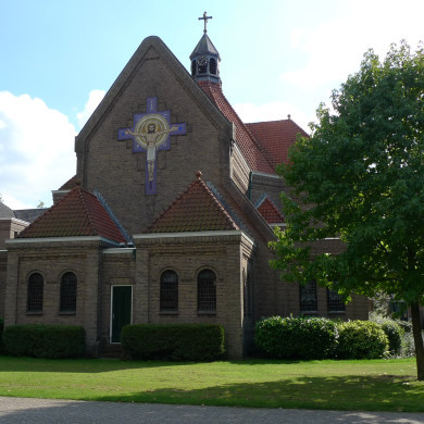 Het geheel is uitgevoerd in baksteen en voorzien van lisenen en baksteen lijsten. Op de topgevel die het meest in het zicht ligt bij aankomst vanaf de Aalsterweg is met geglazuurde tegels een voorstelling van een gekruisigde Christus aangebracht, deze afbeelding wordt benadrukt door het metselwerk eromheen dat in een kruisvorm in reliëf is aangebracht.