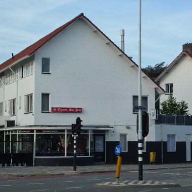 Drielaags hoekpand met een ronde, omlopende erker op de begane grond. In deze erker zijn grote ramen aangebracht.