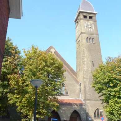 Driebeukige bakstenen kerk met een hoog en breed rechthoekig schip onder zadeldak. Ervoor ligt een iets lager gedeelte met een breed spitsboograam (corresponderend met de orgelgalerij uit het interieur) met bakstenen montants en een kruis in de geveltop. Daarvoor is een breed, lager, ingangsportaal onder lessenaarsdak aangebracht. Dit portaal is voorzien van drie spitsboogopeningen. Rechts van de ingangspartij is een hoge vierkante toren, zich piramidaal verjongend, onder een gebogen kegeldak geplaatst. Op de begane grond is hierin een spitsboograam aanwezig terwijl de schacht erboven grotendeels blind is (op enkele smalle lichtspleten na). Bovenaan dit gevelvlak is tegen elke zijde een groep van drie smalle spitsboogramen geplaatst. Direkt onder de galmgaten bevindt zich tegen elk van de vier zijden van de toren een wijzerplaat, horizontaal in de gevel onderscheiden door baksteenlijsten. Links van de ingangspartij is een blokvormige kapel onder een hoog kegeldak gebouwd. Op de begane grond is deze voorzien van brede spitsboogramen. De bovenste rand in het gevelvlak, afgescheiden door baksteenlijsten, heeft vierkante blindnissen.