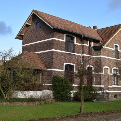 Het tweelaagse onderkelderde gebouw heeft een l-vormige plattegrond. De gevels zijn opgetrokken uit Belgische rode baksteen met wit gepleisterde speklagen. Op het samengestelde zadeldak, dat een overstek heeft aan de zijden, liggen vernieuwde kunstleien.