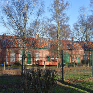 De muren zijn voorzien van rechte steekankers en een muizetandlijst onder de goot. Links en rechts zijn er vier traveeën voor de woningen, twee ramen, een deur en een laatste raam. De schuifvensters hebben een kleine roedenverdeling, hardsteen dorpels en een afsluitende rondboog met siermetselwerk, aanzet- en sluitstenen rondom. Het boogveld zelf is in vlechtpatroon gemetseld. De vernieuwde paneeldeuren hebben een rondbogig bovenlicht met sierroeden. De boog is afgezet met siermetselwerk en aanzet- en sluitstenen. De huizen worden van elkaar gescheiden door het stalgedeelte, met getoogde zesruits stalvensters en getoogde staldeuren. De hoge deeldeuren in het midden zijn halfrond gesloten en afgewerkt zoals bij de bovenlichten van ramen en deuren.