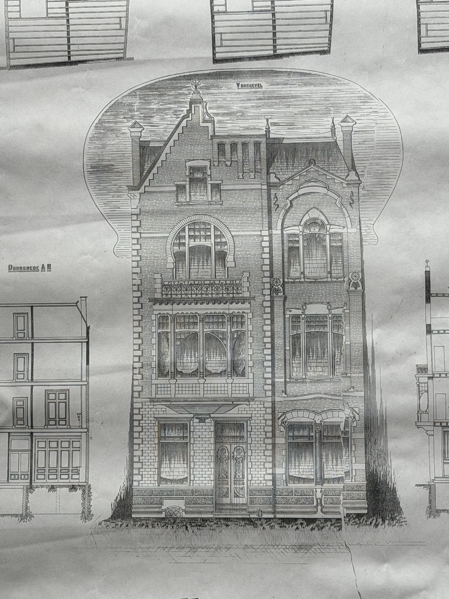 Het huis is opgetrokken uit rode gebakken strengperssteen gemetseld in kruisverband, in de voorgevel afgewisseld door natuursteen in diverse kleuren en soorten voor speklagen, afzaten, bogen, profiellijsten, lateien, erkerbasis en aanzetstenen van de risaliet. Onderdelen hiervan bevatten beeldhouwwerk met florale motieven. De voorgevel heeft een rustica basement en een bekroonde natuurstenen afdekking. Smeedwerk voor balkonbalustrade en raamhekken. Muuropeningen met houten schuifvensters en puien met gebogen wisseldorpels en geometrische roedenverdeling in de bovenlichten voorzien van gekleurd figuurglas.