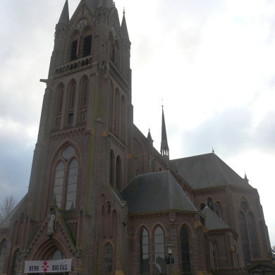 KERK in Neo-Gotische stijl met toren en dakruiter uit 1903 van architect C.F. van Hoof uit Tilburg.