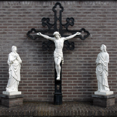 De drie witgeschilderde gietijzeren beelden staan op een omstreeks 1985 naar oorspronkelijk voorbeeld vernieuwde bakstenen onderbouw. Deze brede bakstenen onderbouw wordt aan de uiteinden geschoord door twee pijlers, waar op getrapte natuurstenen sokkel de ca. een meter hoge beelden van Maria en Johannes de evengelist zijn geplaatst. Centraal op de bakstenen muur staat het ca. 1.5 meter hoge kruisbeeld (identiek aan dat op het kerkhof van de St. Willibrordus te Deurne), waarvan het kruis van smeedijzer is vervaardigd.