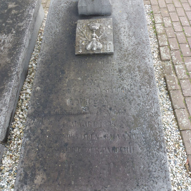 Hardstenen tombe met op de dekplaat een op een hardstenen sokkel opgesteld marmeren kruis. Op de dekplaat een marmeren plaquette met de afbeelding van palmtakken, kelk en kruisen.