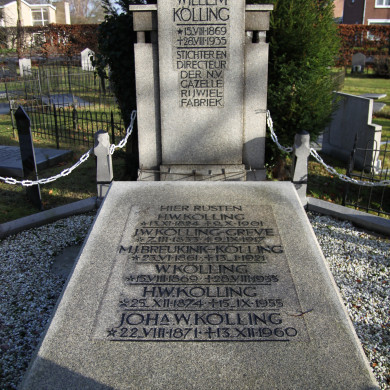 Gaaf bewaard uit het interbellum daterend GRAFMONUMENT van W. Kölling, stichter van de Gazelle Rijwielfabriek. Het graf fungeert tevens als familiegraf en is gelegen in de binnenste cirkel van het kleine rond. Het enige art deco-invloeden vertonende grafmonument beslaat een kwart cirkel. Hierin bevindt zich een hardstenen liggende steen waarachter een vrijstaand hardstenen grafmonument bestaande uit een staande steen met opschrift geflankeerd door twee smalle stenen. Het opschrift van de staande steen vermeldt het volgende: WILLEM / KÖLLING / 15.VIII.1869 / 28.VIII.1935 / STICHTER EN / DIRECTEUR / DER N.V. / GAZELLE / RIJWIEL- / FABRIEK. De liggende steen is voorzien van de volgende tekst: HIER RUSTEN / H.W. KÖLLING / *13_XI.1824 - 9_X.1901 / J.W. KÖLLING-GREVE / *7-II.1833 - 9-IX.1917 / M.J. BREUKINK-KÖLLING / *23-VI.1861 - 13-I.1921 / W. KÖLLING / 15_VIII.1869 - 28-VIII.1935 / H.W. KÖLLING / 25_XII.1874 - 15_IX.1955 / Joha. W. KÖLLING / *22_VIII.1871 - 13_XII.1960.