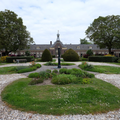 TUINAANLEG van het voorplein en de binnenhof naar ontwerp van D.F. Tersteeg (1876-1942). De aanleg van het voorplein wordt gekenmerkt door een centraal aangelegd cirkelvormig plantsoen met een in het midden geplaatste vlaggemast en een viertal bloembedden. Het terrein aan weerszijden van de hieromheen gelegen oprijlaan heeft een voornamenlijk uit diverse boomsoorten bestaande beplanting waaronder lindebomen, een bruine beuk en een trompetboom. De binnenhof heeft een formele aanleg die gekenmerkt wordt door twee elkaar kruisende assen waarvan één as begint bij de ingang en eindigt bij de in de as van de ingang gelegen kapel en een tweede as de verbinding vormt tussen twee zuilenportico`s. Op de kruising van de twee assen bevindt zich en gietijzeren waterpomp. De beplanting van de tuin bestaat onder andere uit kegelvormig gesnoeide taxus op de hoeken van de vier door gras omzoomde perken, hulst en rozestruiken.