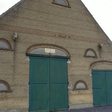 De achtergevel bevat binnen de top een dichtgemetseld stalvenster als elders. Tegen de gevel werd een moderne uitbouw gerealiseerd (geen monumentale waarde).