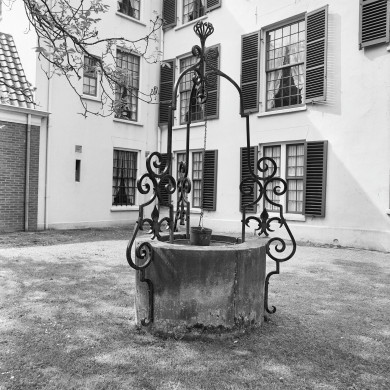 Direct achter het huis staat een als decoratie gebouwde WATERPUT uit circa 1870 bestaande uit een natuurstenen onderdeel waarop een ijzerconstructie met krullen en Franse lelie waaraan de putemmer hangt.